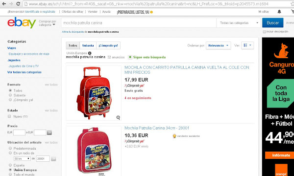 En vez de seguir pateando calles y centros comerciales, pues voy a eBay, accedo a la sección de colecciones de tendencias, y una vez allí en el buscador escribo "mochila patrulla canina" y filtro (tips de eBay) por que el producto provenga de España o de algún otro país de la Unión Europea, para que así nos llegue a tiempo para la #VueltaAlCole, que si lo pedimos a un proveedor de China, seguro que llega, pero mas tarde.