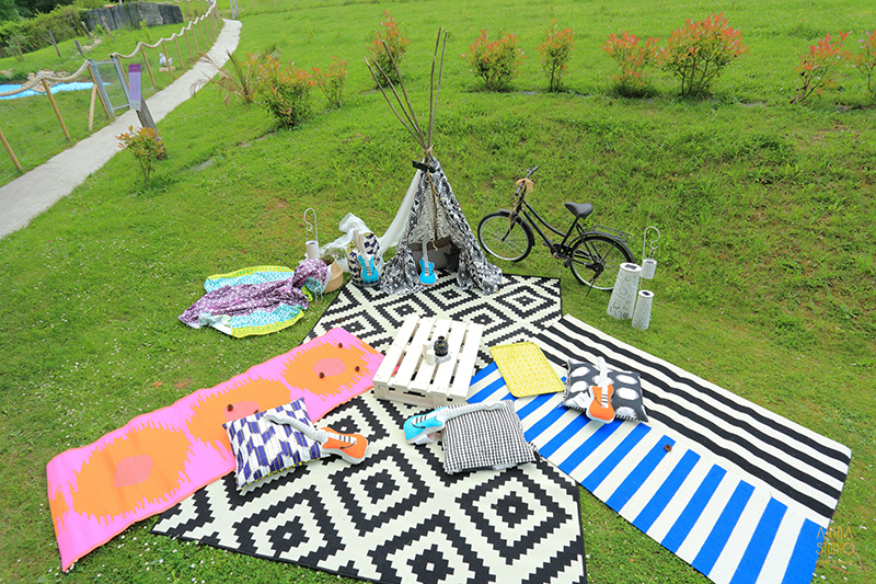 Todos los textiles y materiales que usamos como las lámparas solares, los cestos, o los candelabros son de Ikea... ¡Muchas gracias por todo vuestra ayuda amigos! El único proyecto familiar que incluimos fueron estas flechas de pizarra y el tipi, cuyo proceso diy os enseñaremos otro día... ¡Ya veréis que fácil! Lo acompañamos de una bicicleta, un palet a modo de mesa, y estos cojines que como ya sabéis, hizo mi ama ;)