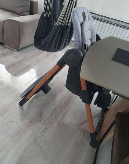 Por otro lado, ofrece comodidad por su asiento amplio y profundo, revestido de un tejido agradable al tacto. El reposapiés extraíble asegura a las piernas un apoyo adecuado. A mayores, su estructura favorece una postura correcta durante la comida.