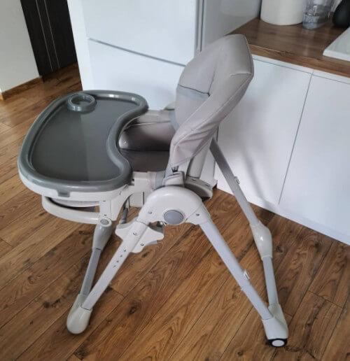 Por un lado, es compacta y fácil de transportar. Una vez cerrada, se mantiene en pie y es fácil de mover gracias a sus 4 ruedas con freno. Si vais a comer fuera de casa, se puede transformar en un cómodo elevador de silla y llevártelo a cualquier parte.