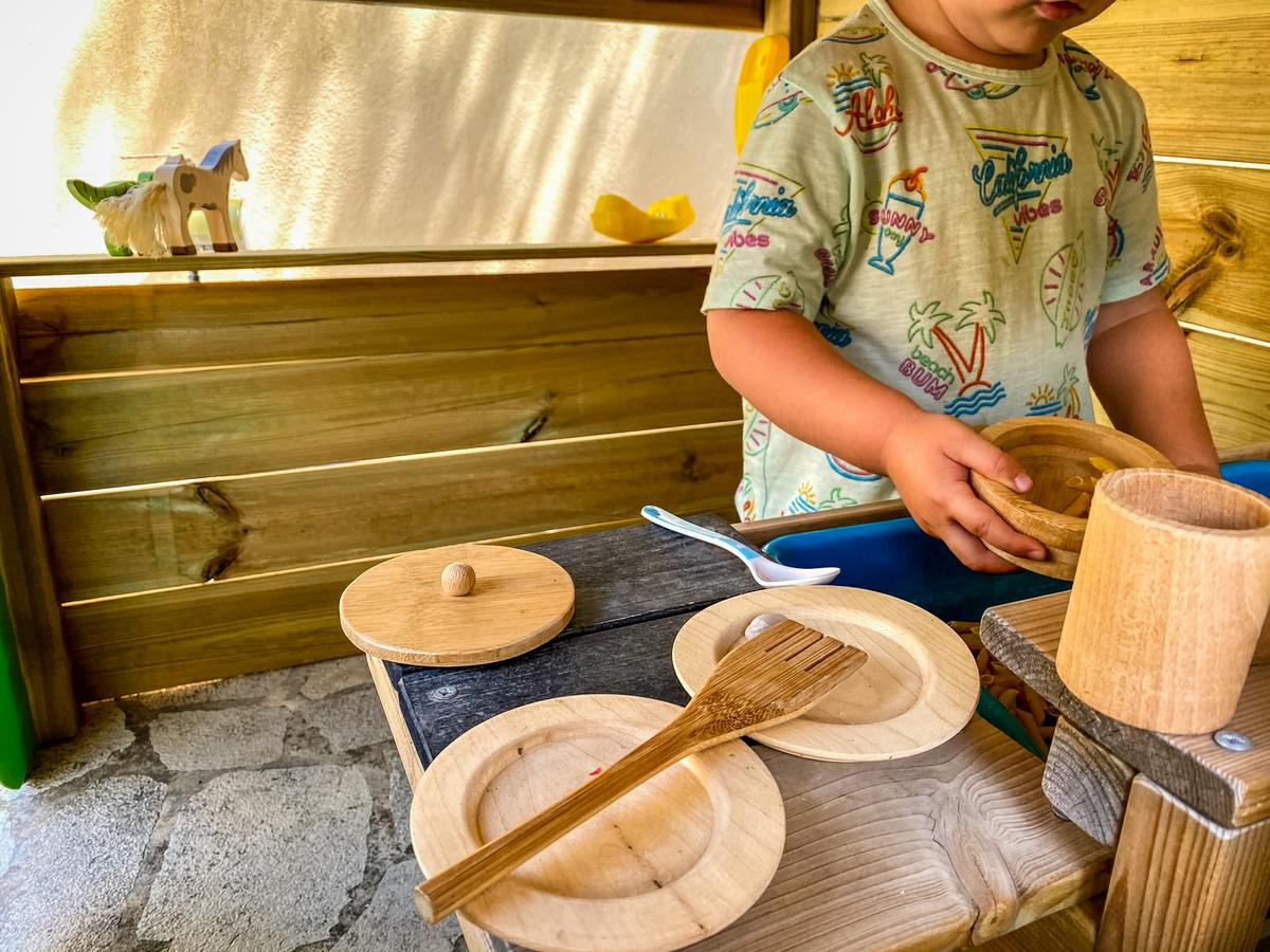 En los jardines de infancia Waldorf se tiene muy en cuenta la importancia de tener espacios contrastados, espacios abiertos, libres, expansivos y por otro lado espacios más cerrados, en los que haya juego de luminosidad y más oscuridad, techos bajos y techos altos, todo pensado para estimular un juego libre y saludable.Por eso las casitas y las cabañas siempre están presentes.