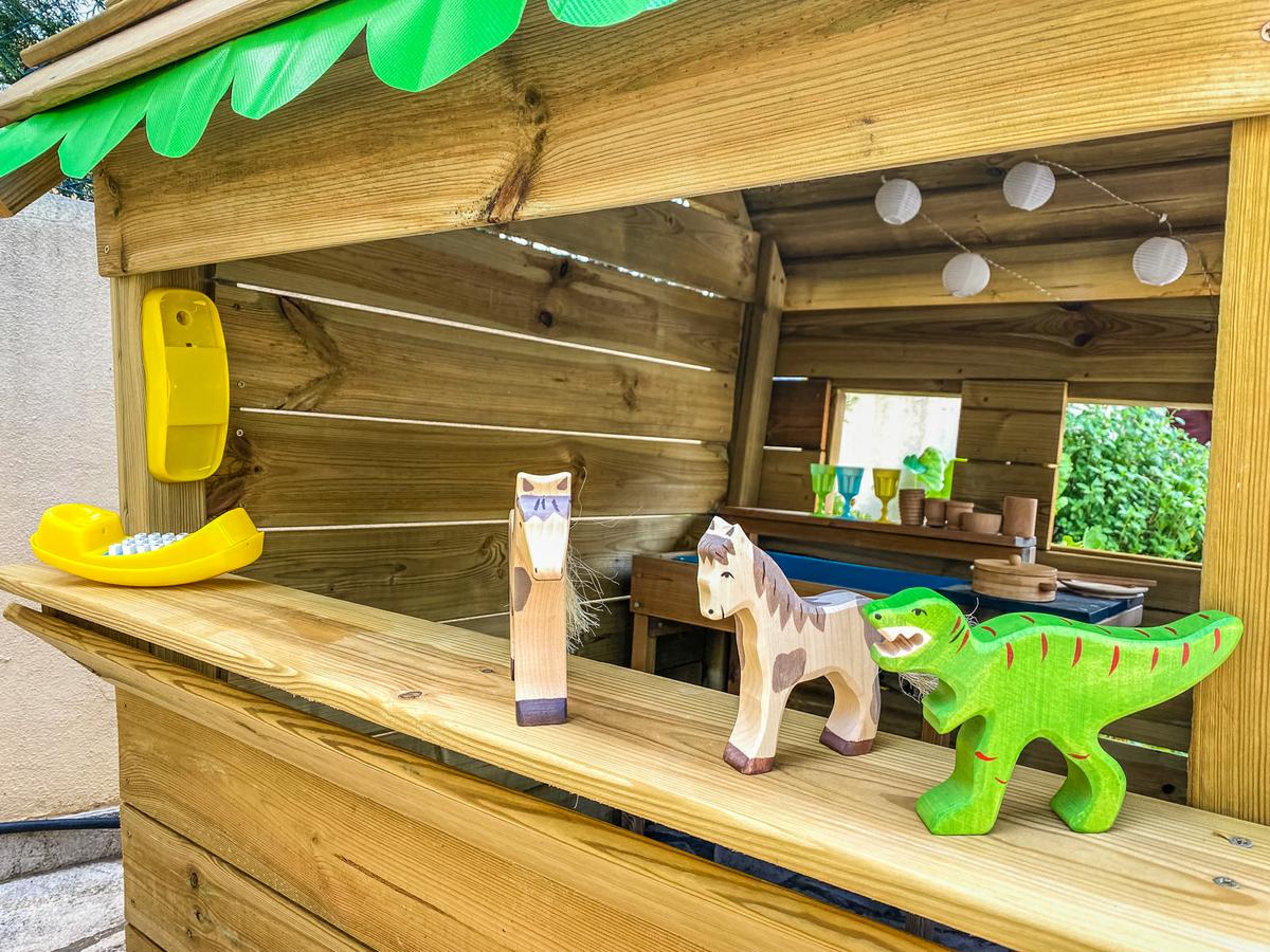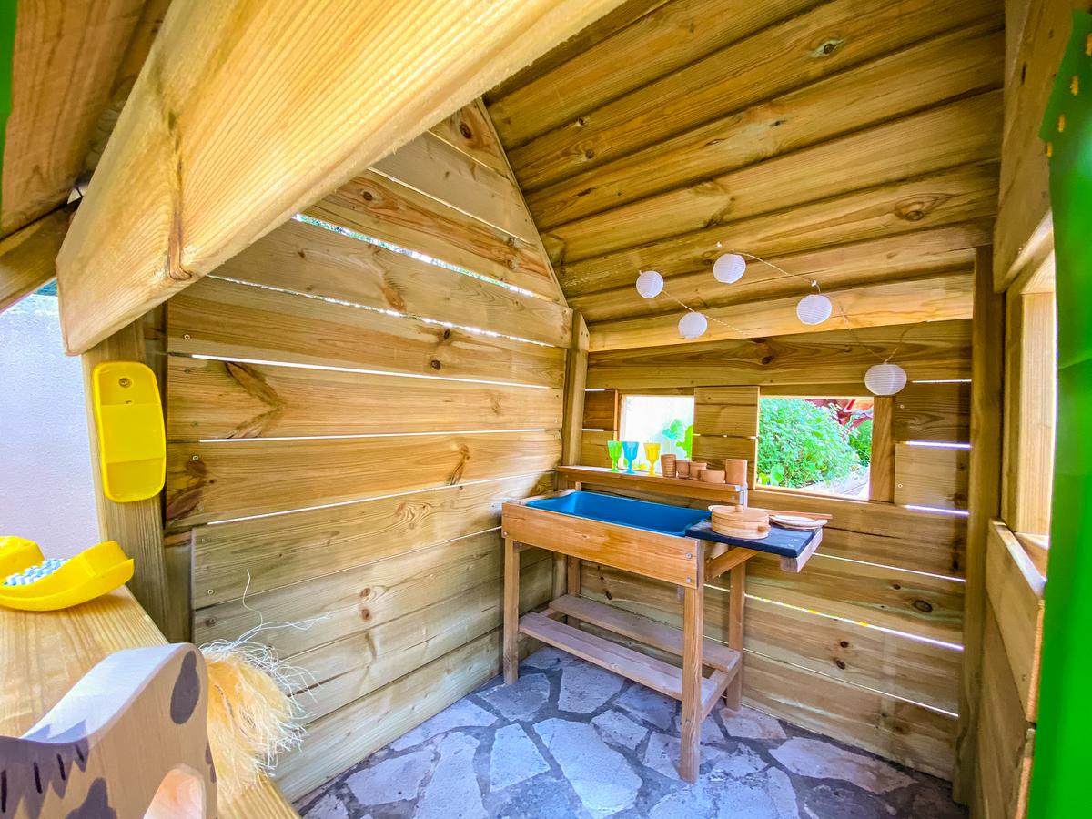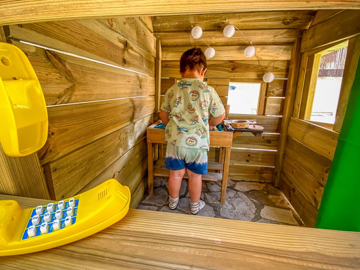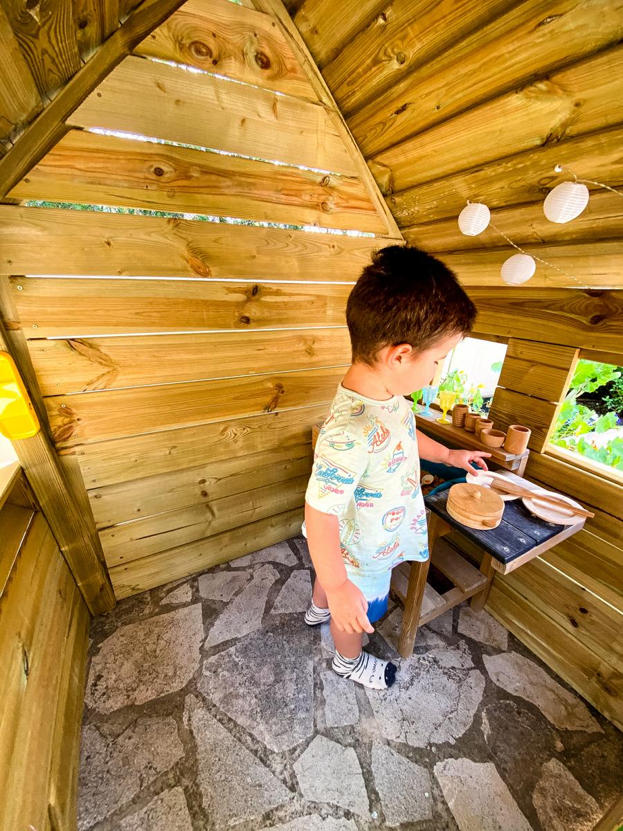 Por dentro es muy amplia, yo misma puedo estar completamente de pie en el interior, e instalamos un teléfono, unas cortinas de vinilo (ambos complementos disponibles en la web de Wickey), unos farolillos solares y una cocinita de experimentación de exterior que ya teníamos de antes y donde vamos poniendo diferentes materiales para jugar y experimentar.