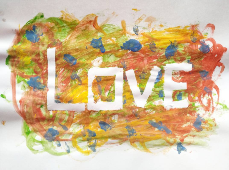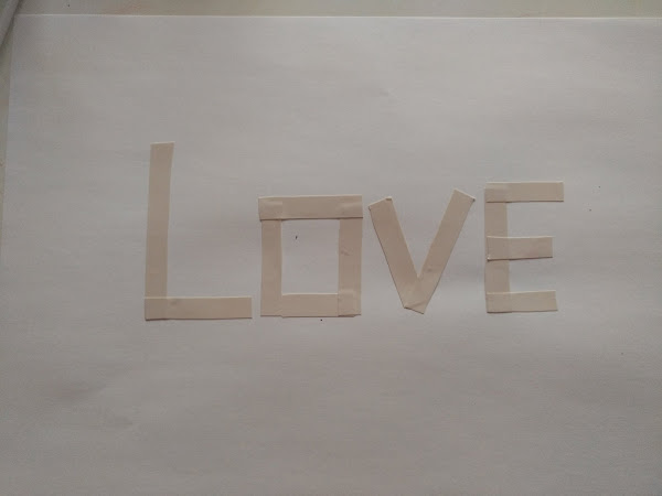 Con esta manualidad repartimos mucho love para todos. Hemos utilizado cinta adhesiva blanca que se despega con facilidad del papel (cinta de carrocero de baja adhesión). Hemos elaborado con ella la palabra love, colocándola sobre el papel. Seguido hemos pintado con pintura al ritmo de la música, con diferentes colores y haciendo diferentes movimientos.