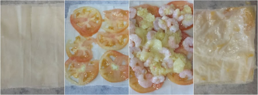 - Cortar tomate en láminas finas o colocar sobre la masa filo. A continuación cubrir con las gambas junto con el calabacín.
