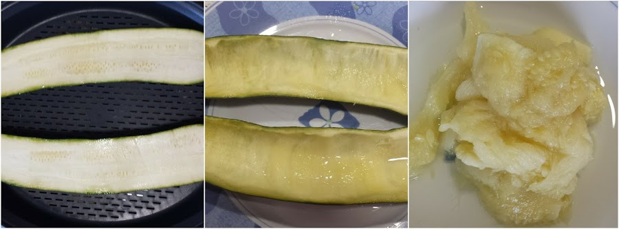 - Preparar al vapor el calabacín, en el microondas o en una cecerola unos minutos para separar la carne. Podéis hacerlo directamente cortando el calabacín en lonchas muy finitas pero como a mi me gusta que esté muy blandito, por eso prefiero cocinarlo un poco antes. Pero si queréis ahorraros este paso, porque después podéis rehogarlo también un pelín.