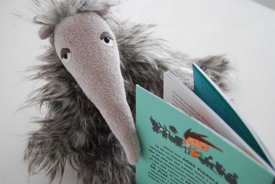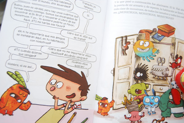 Pero los dibujos por sí mismos no nos valen, los libros que recomendamos tienen que tener una buena historia y la de cómo aparece el señor Flat, ese monstruo devorador de libros, en la vida de Agus, lo es. A mí personalmente me ha encantado cómo narran la comunicación ( difícil, a veces imposible) entre Agus y sus padres (muy fácil sentirse identificado...). Pero quien os dará una opinión más "profesional" sobre el libro, es Malena, 10 años (ya....) y crítica literaria a tiempo parcial :-):