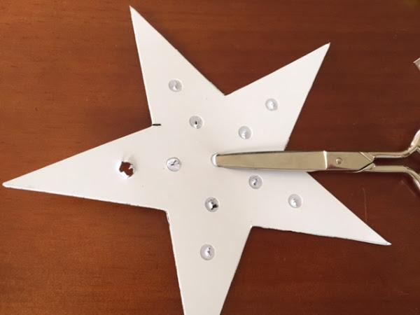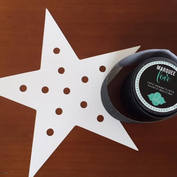 La letra viene recortada en cartón troquelado para las bombillas y esa es la cartulina que nosotras forramos de washitape de purpurina. Después de forrarla, repasaremos los agujeros con una tijera. Ponemos la cartulina dentro de la letra y empezamos a poner las bombillas por la parte exterior.
