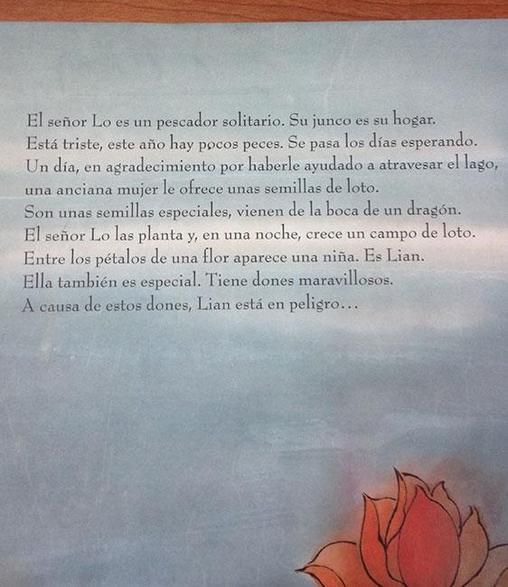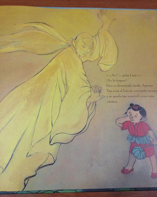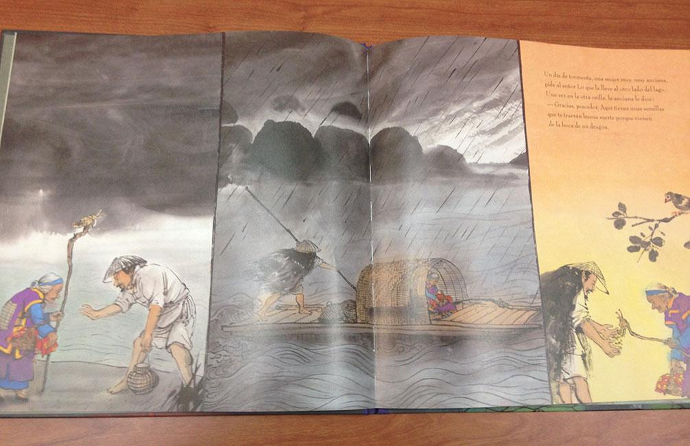 Es un cuento en gran formato, de la Editorial Corimbo y escrito por Chen Jiang Hong. La verdad es que todo el tiene transmite la cultura oriental al completo. Al usar palabras como “Prefecto” para indicar a uno de los personajes del cuento, que ostenta un cargo de poder en la Prefectura China, se introduce vocabulario nuevo a los lectores, que les hace situarse y adentrarse en la cultura china.