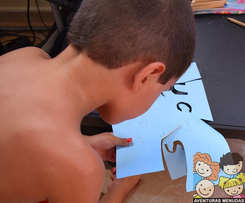 Lo que hicimos fue elegir un folio con el color que querían que tuviera el nombre y formamos cada letra con grosor para que pudieran recortarla. Fueron ellos los que recortaron sus letras y las pegaron en la portada de su correspondiente libreta.
