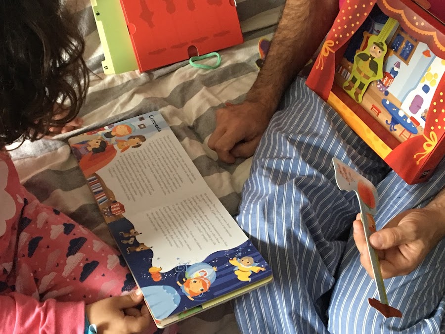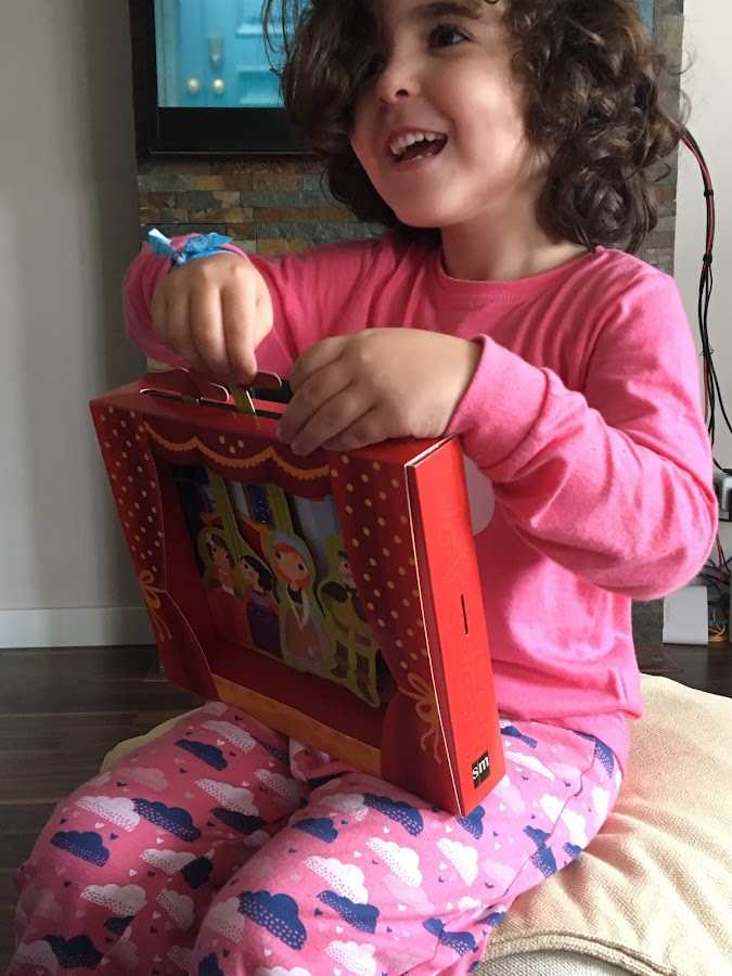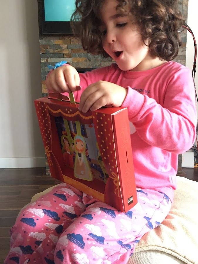 La caja consta de 3 libros : Blancanieves, Cenicienta y La Bella Durmiente . Cuentos más que conocidos y que les facilita a los más peques la comprensión de las historias. Hay 5 decorados y 9 personajes dobles para ir interpretando cada uno de los cuentos. Es una pasada como les encanta a los niños y la cara de ilusión...y esto me llevó a pensar en lo importante que es aprovechar un rato del día con ellos, centrada en ellos, alejada del móvil, del trabajo....y eso precisamente es a lo que te obliga este libro teatro . Ahora os paso algunas de las imágenes! Este día fue Papi quién realizó la labor de trovador !! jajajaja como podéis ver los dibujos son muy simpáticos. Los presonajes viene con unos soportes que hacen su manipulación muy fácil.