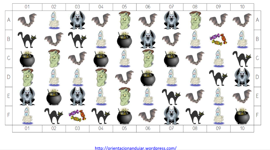Estas fichas nos van a ser de utilidad para trabajar la atención, orientación espacial y la identificación. Constan de una tabla con 10 filas y 6 columnas. En las matrices se han colocado dibujos relacionados con la festividadad de HALLOWEN, las columnas van nombradas con números y las filas con letras para la posterior identificación.En cada una de estas matrices el alumno deberá de identificar los dibujos que hay en cada fila y columna igual al modelo. Y luego relenar la ficha de solucines que hemos prparado a tal efecto. PINCHA AQUÍ PARA DESCARGAR