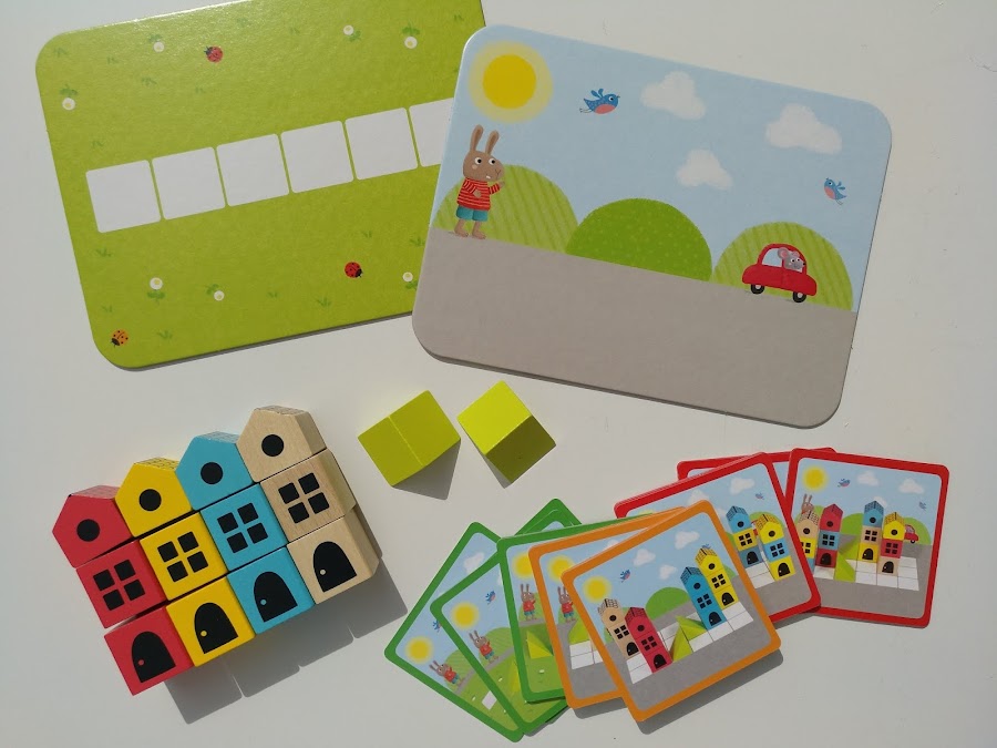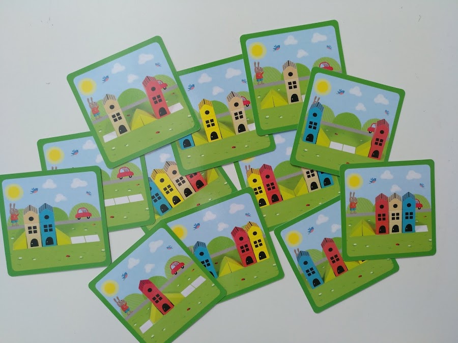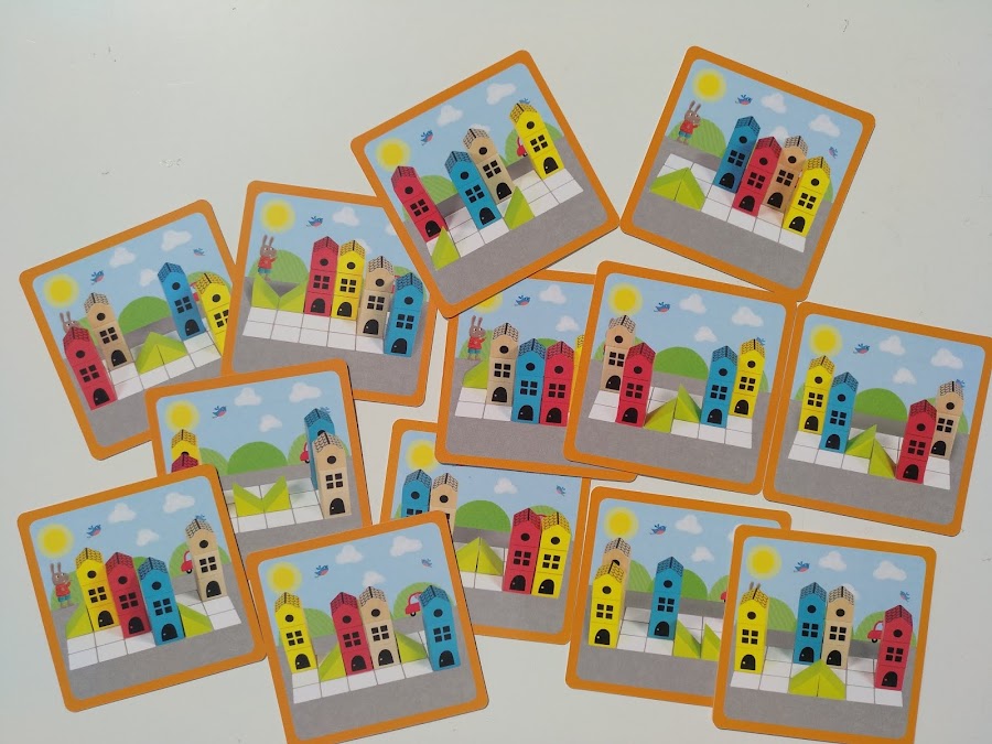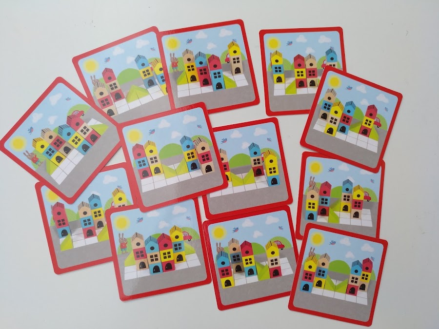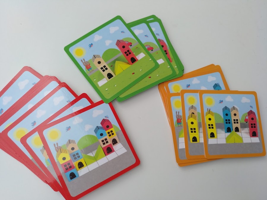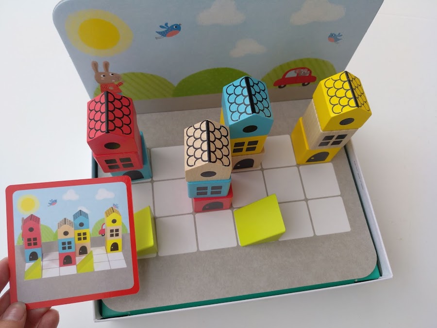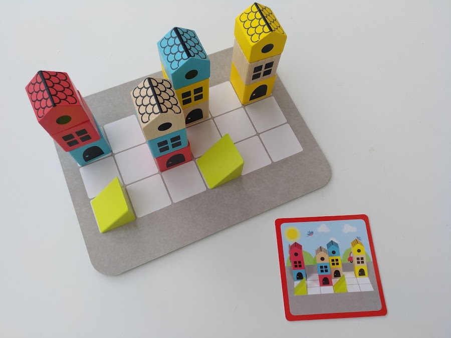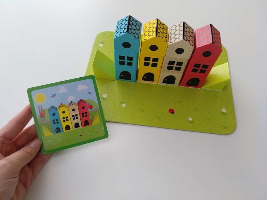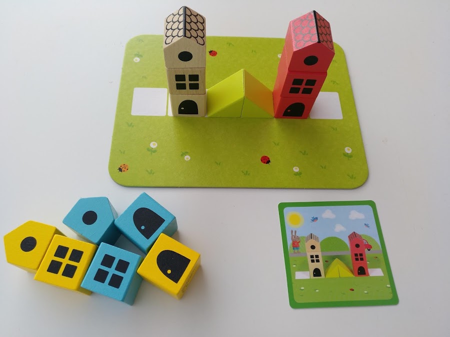 Los peques tienen que construir las casitas con las piezas de madera para que queden colocadas como muestra cada carta desafío, trabajando así conceptos espaciales básicos (arriba, abajo, delante, detrás...).
