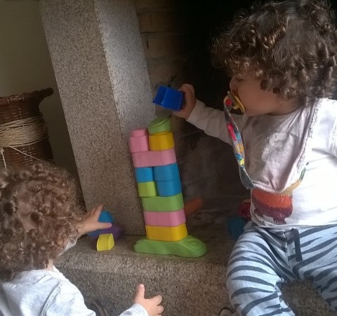 Los dos realizan garabatos aunque no controlen nada bien los lápices. Son capaces de apilar hasta 5 objetos uno encima de otro. Imitan todo lo que hacemos, esta semana aprendieron a soplar. Ya saben beber por una pajita. También reconocen cuando se van a acabar sus dibujos favoritos, empiezan a entender mejor todo lo que funciona en casa.