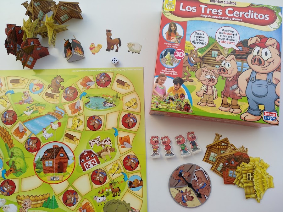 Hoy os enseño un juego divertidísimo con el que disfrutamos mucho en casa y en el aula. Es un juego de mesa dinámico basado en el cuento de los 3 cerditos, un clásico que siempre gusta. Nuestro objetivo es ayudar a los cerditos a conseguir las piezas necesarias para cada tipo de casa hasta tenerlas completas.