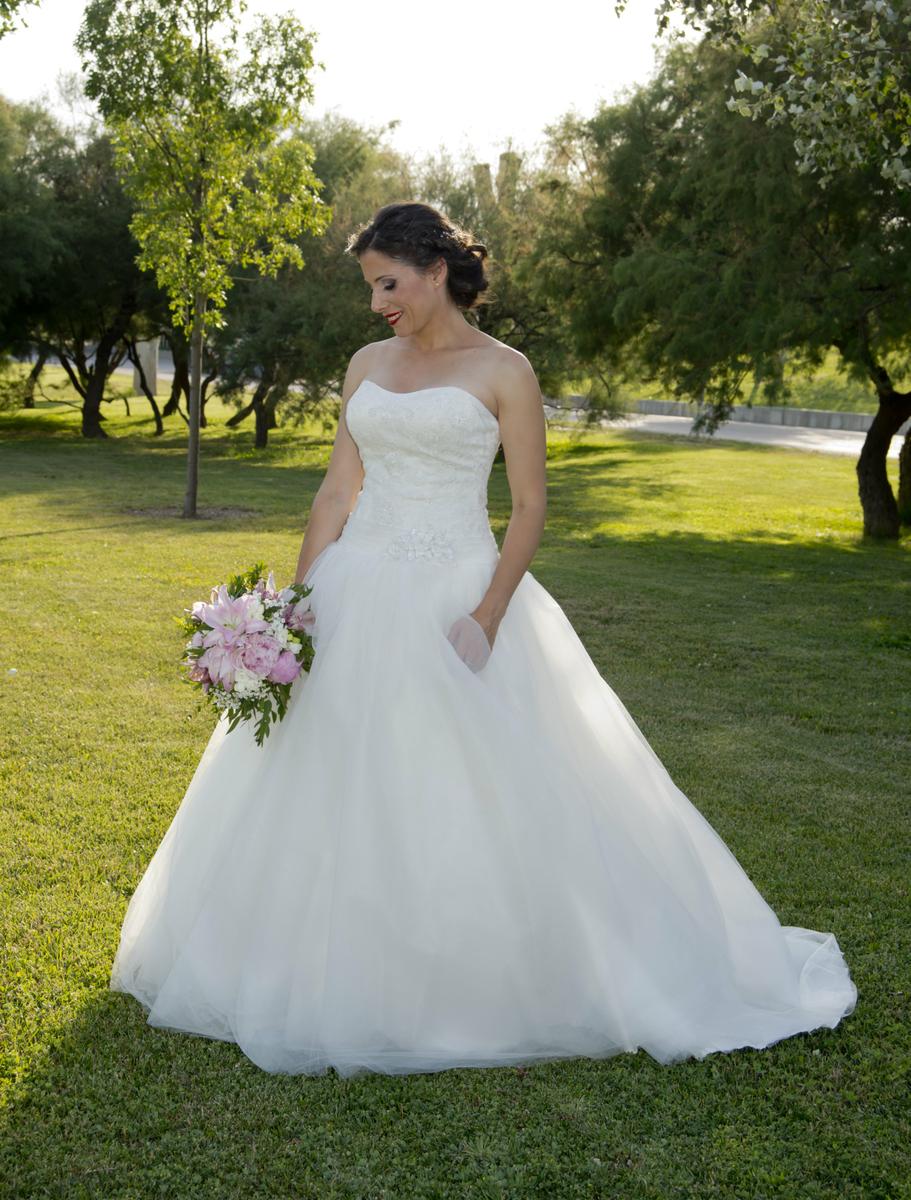 Aquí estaba el vestido, “MI VESTIDO” de Adriana Alier: un cuerpo hasta la cadera, con pequeña pedrería e hilos de plata, escote palabra de honor y La falda suaves capas de tul para darle volumen… Sin velo ni mantilla. Sencillo y bonito… el mas bonito! (Y yo que voy a decir!)