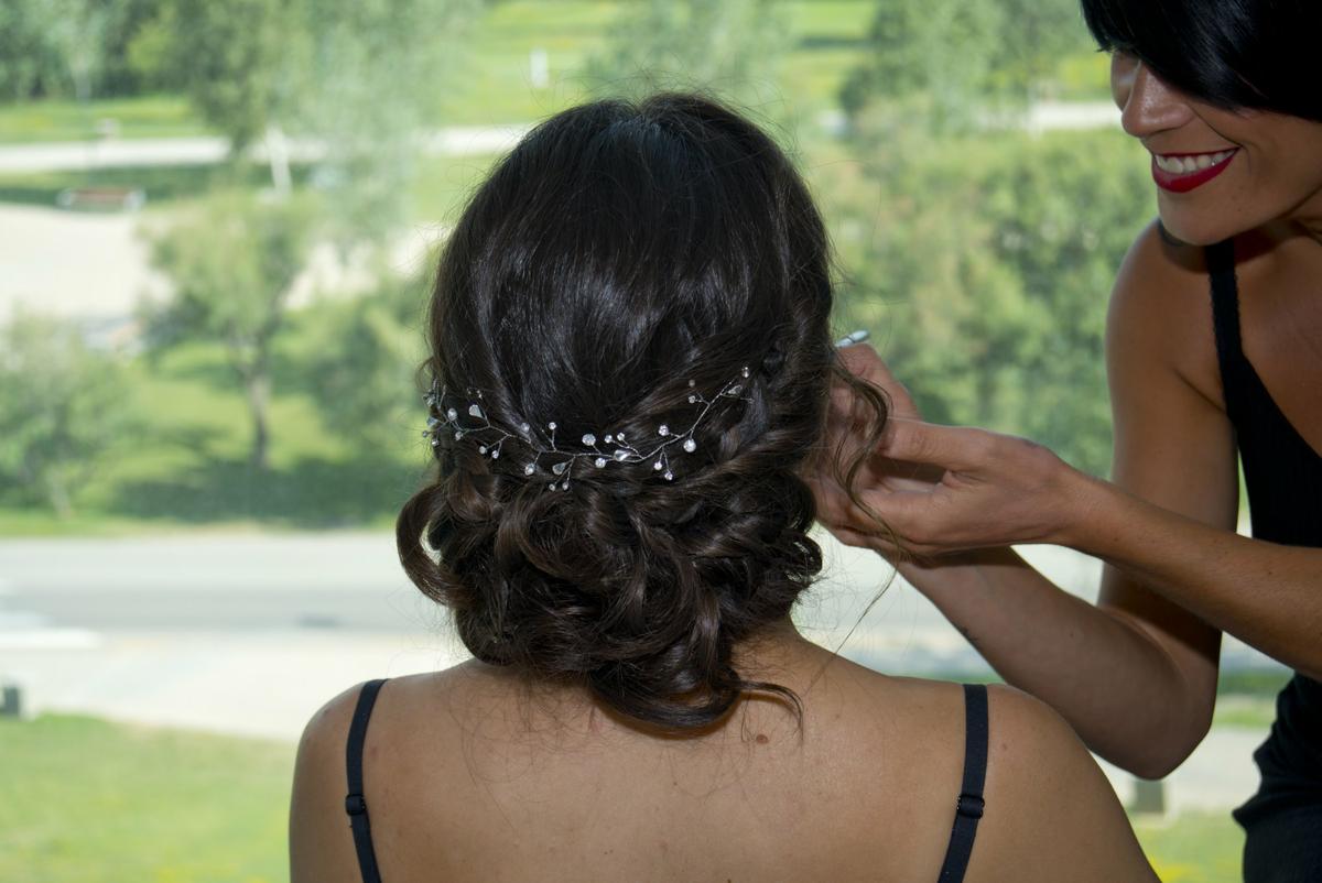 El tocado del pelo fue prestado y es exactamente lo que estaba buscando: Pequeño y discreto. Una diadema muy fina en plata vieja y con aplicaciones en pedrería de Pronovias.