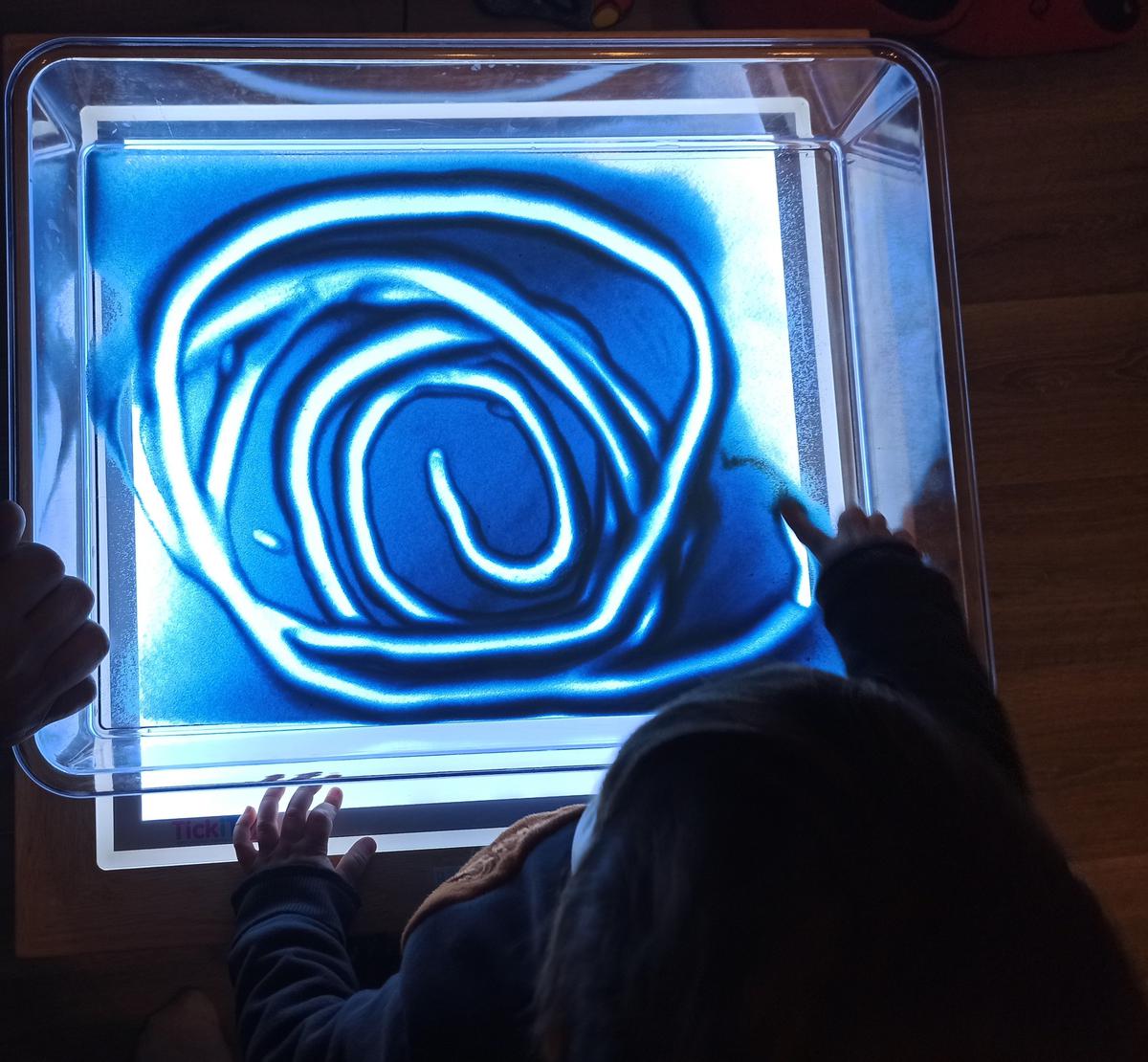 En la mesa de luz se pueden hacer un montón de actividades sensoriales, de iniciación al dibujo y la escritura, contar cuentos, trabajar con formas y colores... Las posibilidades son, literalmente, infinitas. Y la diversión es compartida por niño y adulto.