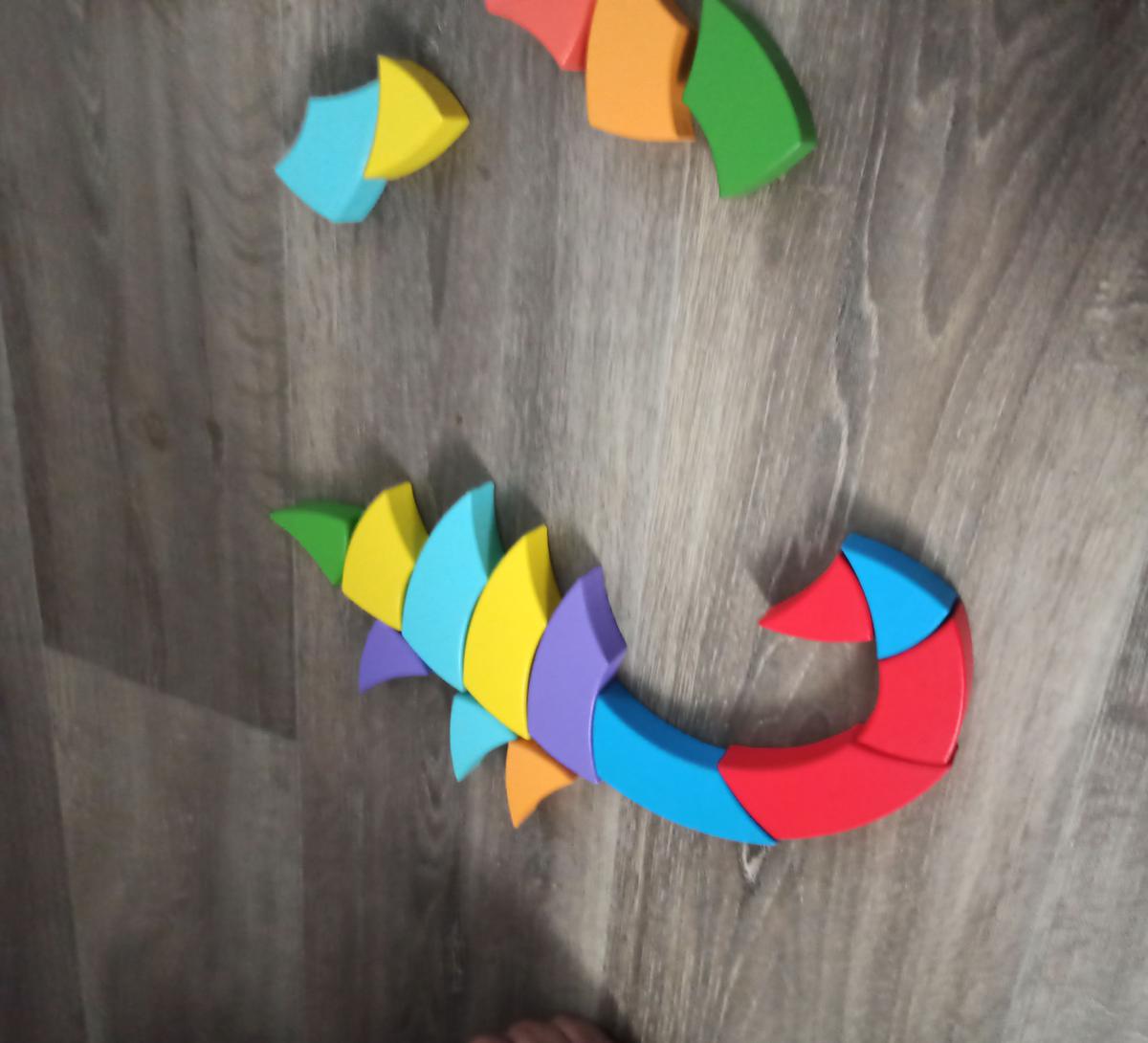 Aunque es un poco complicado para la edad que tiene (2 años y medio), se entretiene clasificado las piezas por colores, intentando averiguar como encajarlas y comparando los tamaños y formas.