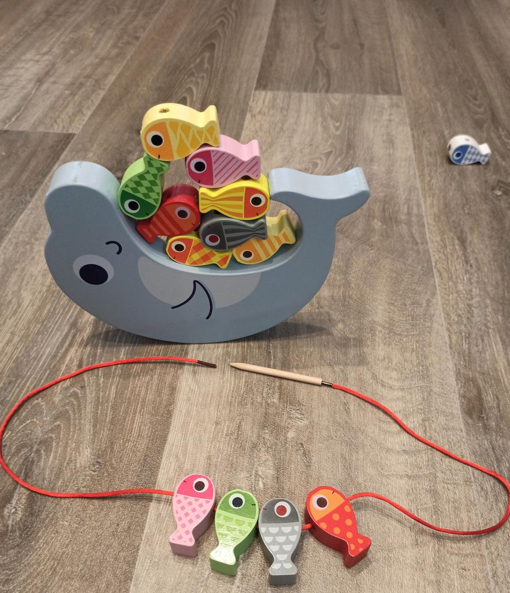 Sus elementos son un delfín grande (bautizado como Pecín) y muchos peces pequeñitos, que pueden pescarse con una caña, ensartarse en una cuerda o colocarse en equilibrio sobre el delfín. Una vez más, queda demostrado que los juegos más sencillos son los que más éxito tienen.