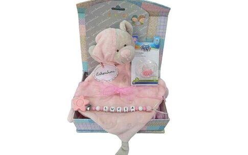 La cajita regalo Mi Doudou es un detalle ideal como regalo de nacimiento.Tu bebé no querrá desprenderse su chupetero y su suave y adorable doudou que lo acompañarán a todas partes.