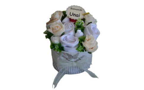 Impresione a los alegres papas con este elegante y original detalle, cuyas flores están formadas por baberos y calcetines 100% algodón.Una original alternativa a las canastillas bebe y tartas de pañales.