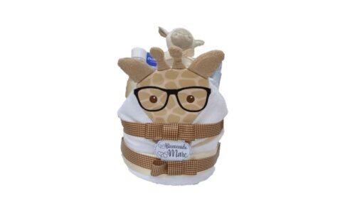 Graciosa y práctica tarta de pañales con una capita de tejido polar con forma de jirafa que puede servir como arrullo o mantita.Puedes añadir los productos que desees a la cesta (en Crea tu propia Canastilla) y nosotros los integraremos dentro de la tarta.