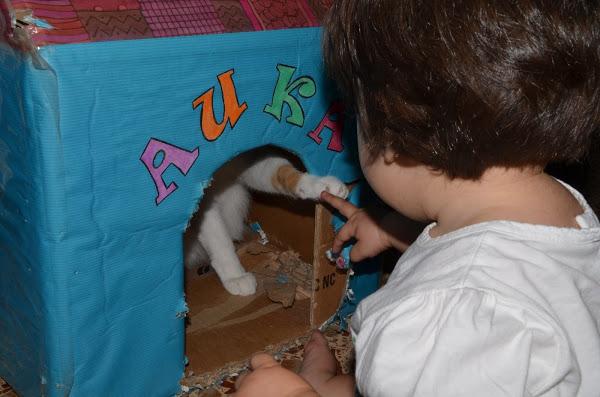 Hay numerosos estudios que dicen que vivir con animales es muy beneficioso para los niños pequeños (ejemplo); a mi no me hace falta ningún estudio; solo tengo que ver a los dos pequeñajos como disfrutan y tratan a la gata (trato fantástico que normalmente es correspondido con un golpe con la pata -déjame-, un minimordisquito inofensivo -déjameeeee- o una huida por la tangente cuando se ve acorralada).