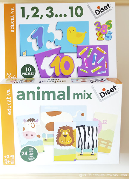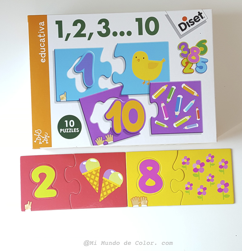 Diset 1,2,3..10: Trae 10 puzzles de 3 piezas, en el que los peques van aprender los números del 1 al 10. Aunque en las instrucciones dice que para niños de 3 años, ha tenido un éxito enorme con mi hija que tiene 24 meses. Sus colores, lo sencillo para armar hace que capte su interés.