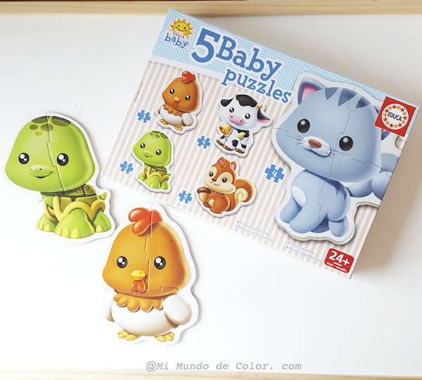Es de la marca Educa y son 5 Baby puzzles, progresivos pensado para los peques a partir de 24 meses. Son piezas mas grandes, mas gruesas, mas fáciles de manipular y me encanta sobre todo que las pestañas son mas pequeñas, así les resulta mas fáciles de encajar.