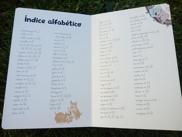 Al final del libro podéis encontrar un sencillo indice alfabético para facilitar encontrar las paginas concretas buscando por el nombre de los animal para responder a vuestro peque os hace una pregunta sobre ello.