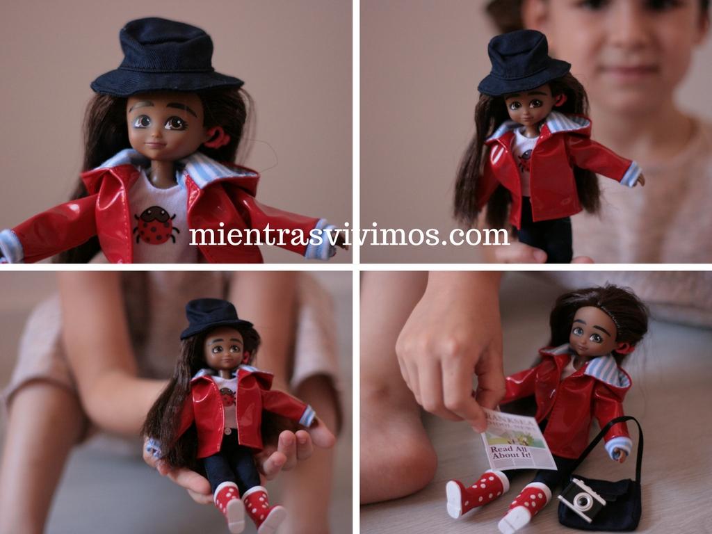 Mía, lleva una camiseta monísima con una mariquita, pantalón, botas de agua con lunares y chubasquero rojo. Además, lleva una bolsa con cámara de fotos, gorro y un periódico. A mis peques les ha encantado esta Lottie, porque les ha parecido diferente a las que ya tenían y rápidamente han encontrado animalitos a los que supuestamente Mía quiere fotografiar, plantas, libros sobre animales, etc… como os digo, Lottie es una fuente de creatividad.