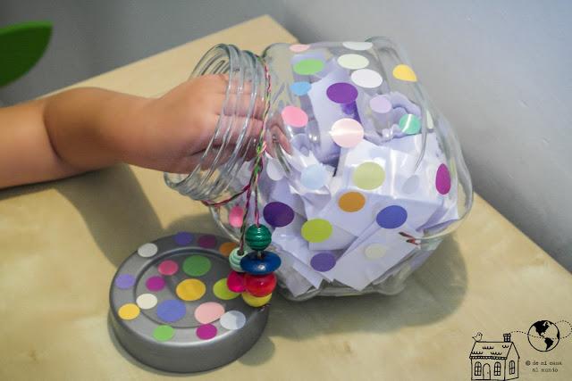 Para ello, hemos utilizado unas pegatinas de círculos de colores y hemos hecho un plin-plin con abalorios.