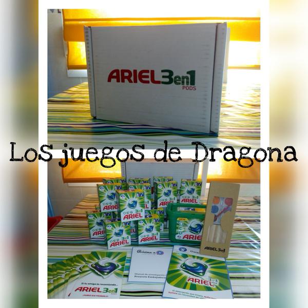 Este es el pack de bienvenida que recibí. Una caja de #ariel3en1, 20 muestras para repartir, 20 cupones descuentos, la guía para saberlo todo sobre el producto, un cuadernillo con encuestas de satisfacción y una cajita con acuarelas y lápices de colores para las peques.