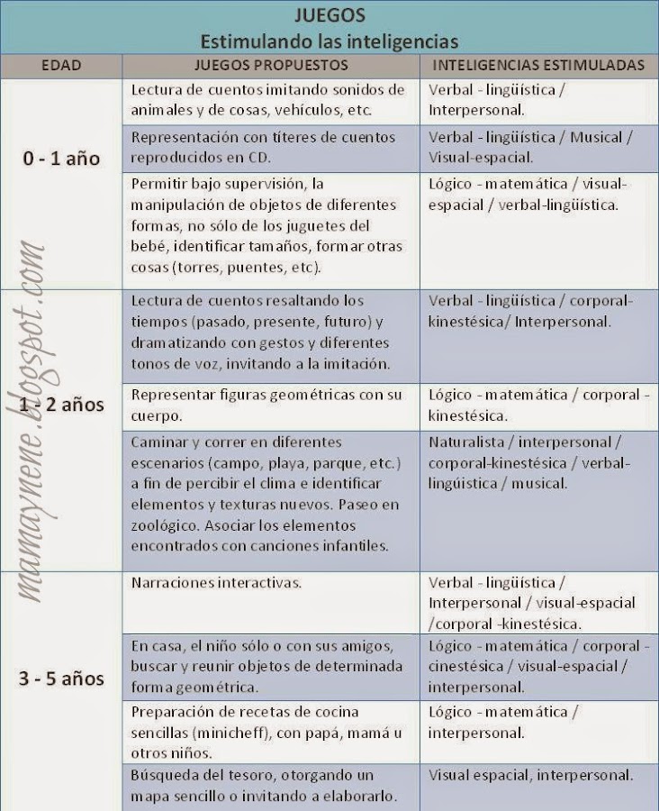 Dado que durante sus primeros años de vida el ser humano posee una gran capacidad para asimilar los estímulos, es que resulta de suma importancia la estimulación de las inteligencias mediante experiencias que permitan la máxima expresión de las mismas a los niveles que puedan ser posibles de alcanzar en cada niño. La estimulación de cada una de las ocho inteligencias en los niños en edad temprana debe apuntar a identificar el potencial con el que cuenta el niño y determinar cuál es la mejor manera que éste pueda desarrollarse de forma integral adaptándose a su manera de aprender contribuyendo así a su desarrollo más armónico y feliz. A continuación, algunas sugerencias para estimular las inteligencias en niños de 0 a 5 años a partir del juego: