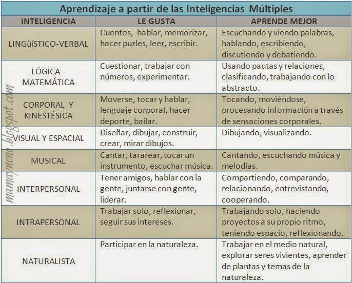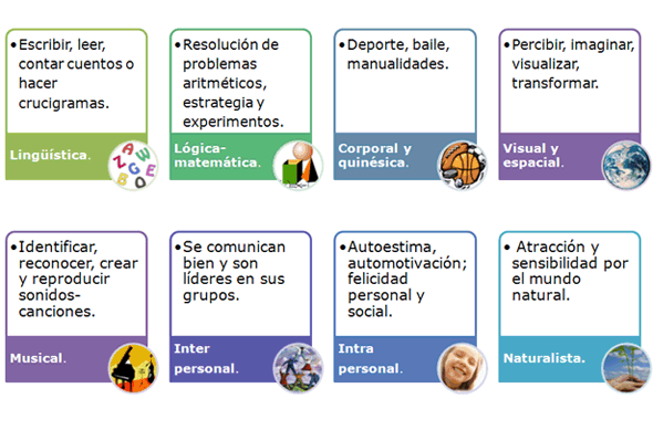 De acuerdo con la teoría desarrollada por Howard Gardner, la inteligencia es un conjunto de capacidades y destrezas que se pueden desarrollar, no negando el componente genético, pero si destacando la importancia del ambiente, las experiencias y la educación recibida. Las inteligencias rara vez operan de manera aislada, sino que se utilizan simultáneamente y tienden a complementarse una a otra. Según Gardner, las inteligencias se clasifican en: lingüística, lógica-matemática, corporal-kinestésica, visual y espacial, musical, interpersonal, intrapersonal y naturalista. A continuación un cuadro que resume las capacidades y manifestaciones de cada tipo de inteligencia: