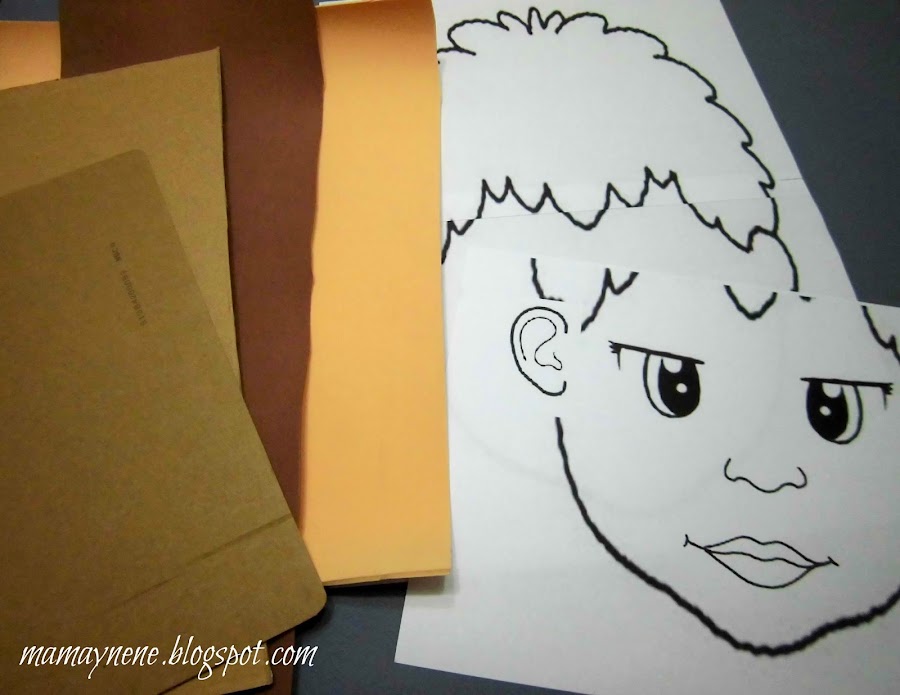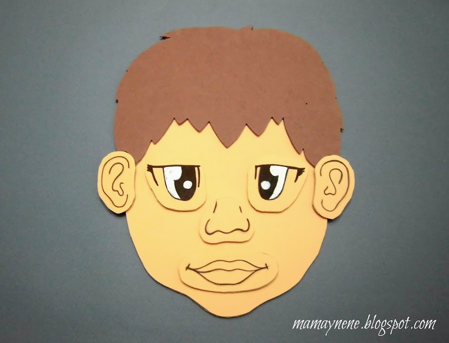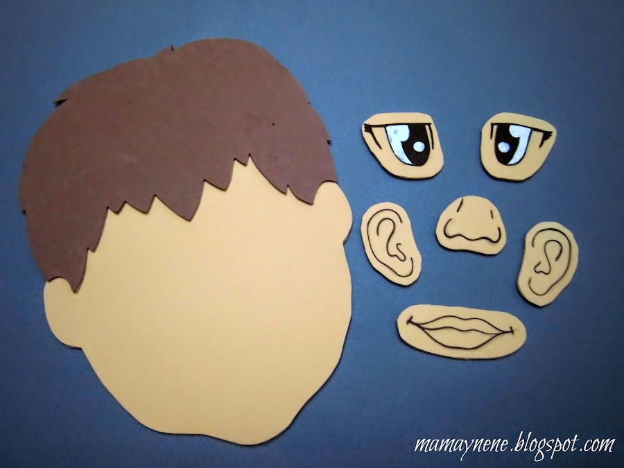 Listo!, si el niño es muy pequeño puede sobreponer las piezas, también puedes colocar pedacitos de limpiatipos en la parte posterior de cada pieza para que al colocarlas se puedan adherir. Sugiero esta forma para que al retirar las piezas la silueta del rostro vuelva a quedar libre.