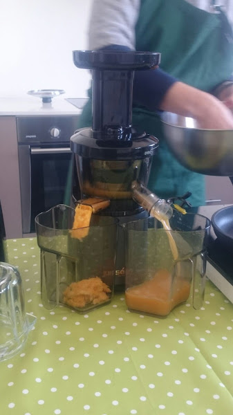 Después de la parte teórica tan interesante cocinó algunas cosas la mar de saludables, interesantes y muy curiosas que a mas de uno nos dejó con la boca abierta, primero porque no suponía un gasto económico y segundo porque estaba riquísimo. Me encanto un zumo de de varias frutas y hortalizas que exprimió en una máquina que vende en su web que separa la pulpa del zumo y en donde por ejemplo nos comentó que cuando hace zumo de zanahoria la pulpa de esta la provecha para hacer albondigas con avena. El zumo que nos preparó estaba riquísimo, una explosión de sabores, de kiwi, naranja (con la cosita blanca), zanahoria, limón, jengibre (importante alimento antiinflamatorio, muy recomendable para tomar en el invierno, porque activa nuestras defensas contra gripes), polvos de camu camu, y luego puso unas semillas ligeramente tostadas en la sartén. Una explosión de sabores, una bomba de vitaminas para nuestro organismo.