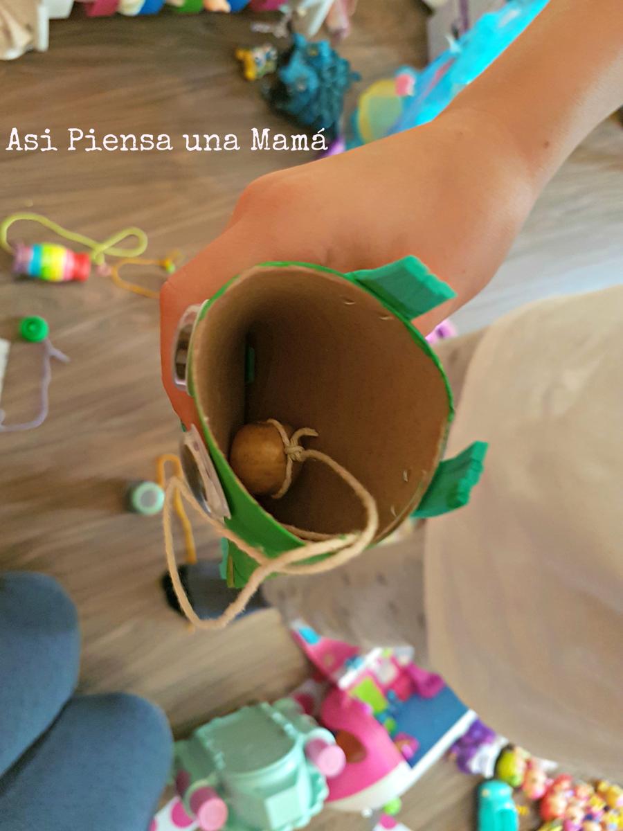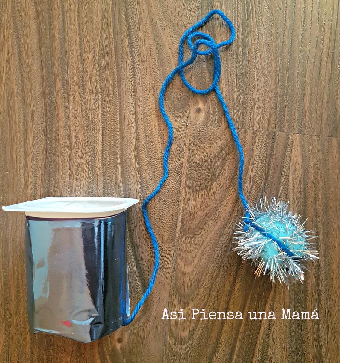 Como el del yogur ya lo habíamos hecho, esta vez le pusimos un pompón en vez de una pelota de goma, así la dificultad era en el poco peso para embocar, pero resultó ser el más fácil.
