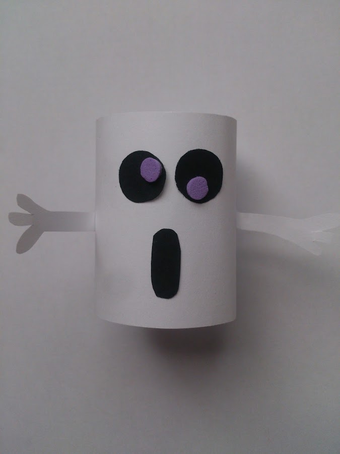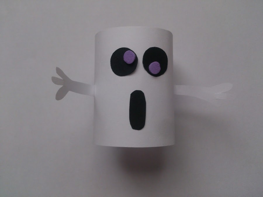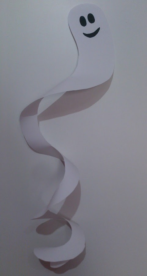 Estos fantasmas de papel son muy chulos, simpáticos y tenebrosos. Solo tienes que recortar un espiral en una cartulina o folio blanco y tendrás este efecto. Después pintale los ojos y una boca con rotulador negro.