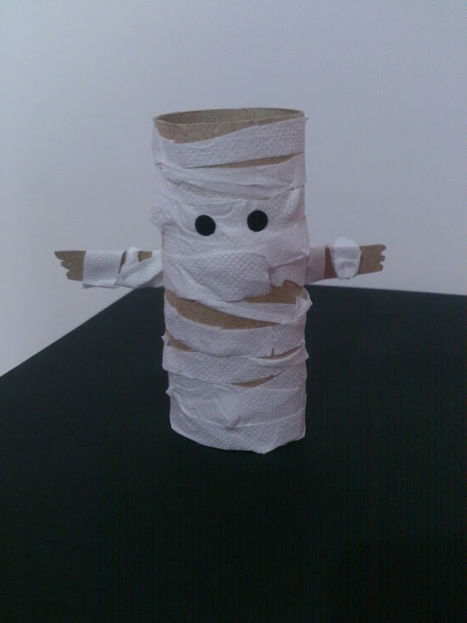 Necesitaremos dos rollos de cartón de papel higiénico para cada momia, uno para recortar los brazos y otro para el cuerpo. Una vez pegadas las partes, cortamos tiras de papel higiénico y vamos enrrollando alrededor de cuerpo y brazos. Luego pegamos los ojos y ¡Momia lista!