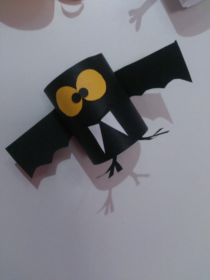 Después añadimos las alas, las patas y los ojos. Seguido pintamos la boca con un rotulador negro y pegamos los colmillos.