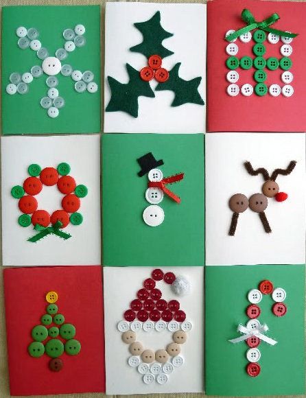 Y por último, para finalizar esta recopilación quiero mostraros unas tarjetas navideñas muy originales que he encontrado. Son ideales para hacerlas con los niños.Están hechas principalmente con botones y adornadas con lazos, fieltro, etc. Se pueden hacer de muchas formas, desde arbolitos de navidad, coronas de acebo, copos de nieve, muñecos de nieve, renos, Santa Claus…en las fotografías podéis haceros una idea de como pueden quedar .