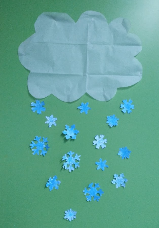 También hemos elaborado nuestra propia nube de invierno, con papel de seda blanco y copitos azules.