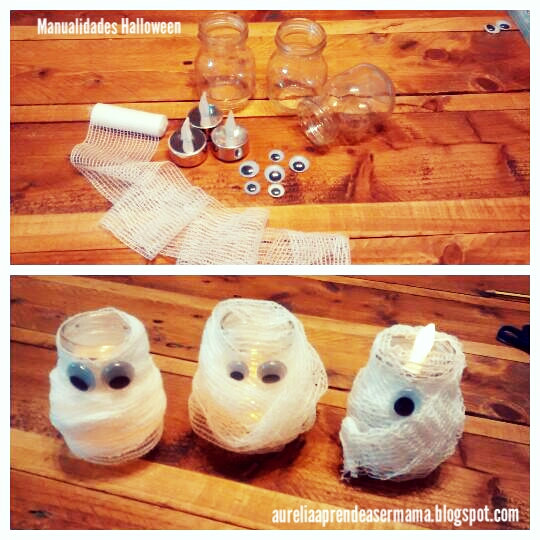 Hemos utilizado, tarritos de paté y tomate en conserva, ojitos, celo, vendas, y unas velas de led.