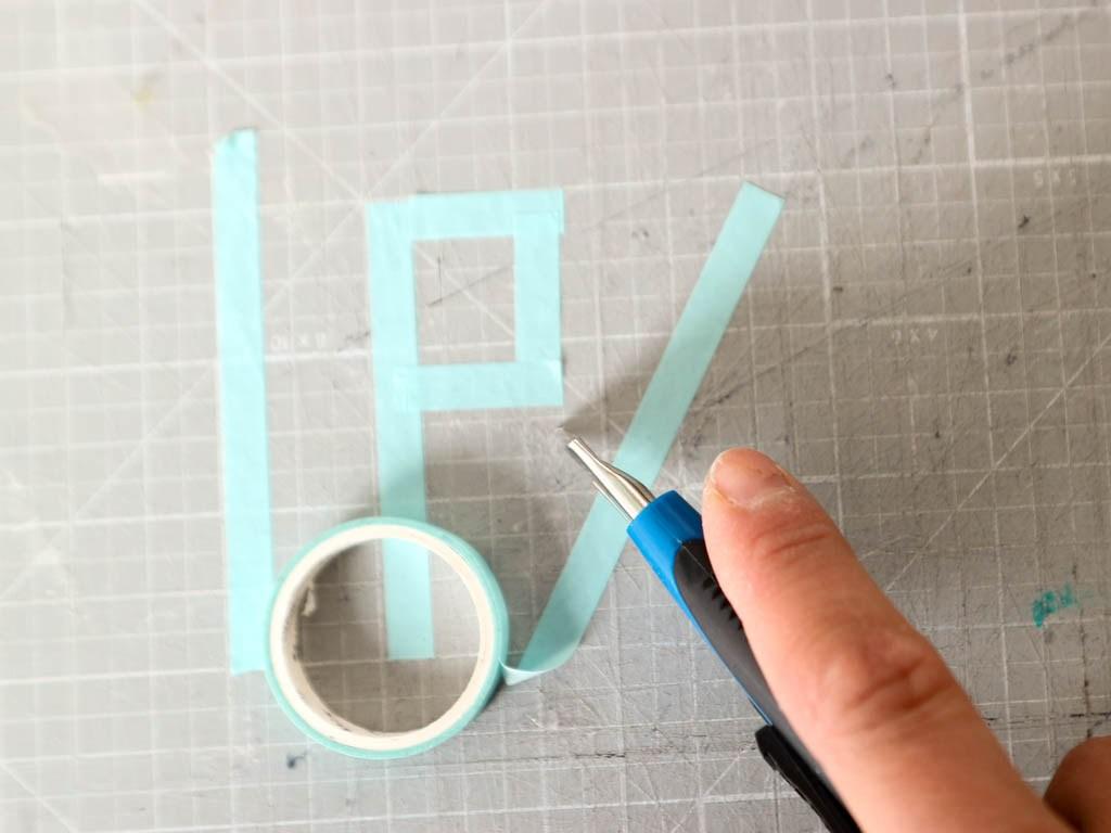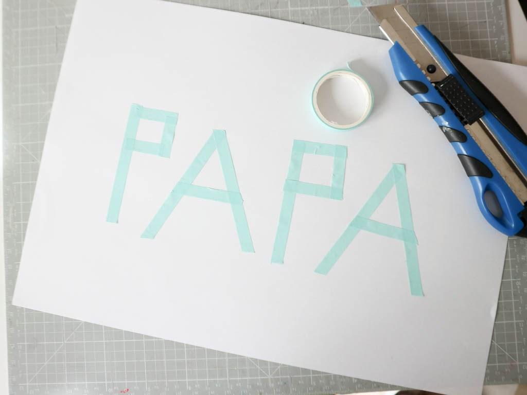 Con ayuda del cuter y la tabla de corte (te será de gran ayuda su cuadricula), corta tiras de washitape para crear la palabra PAPA.