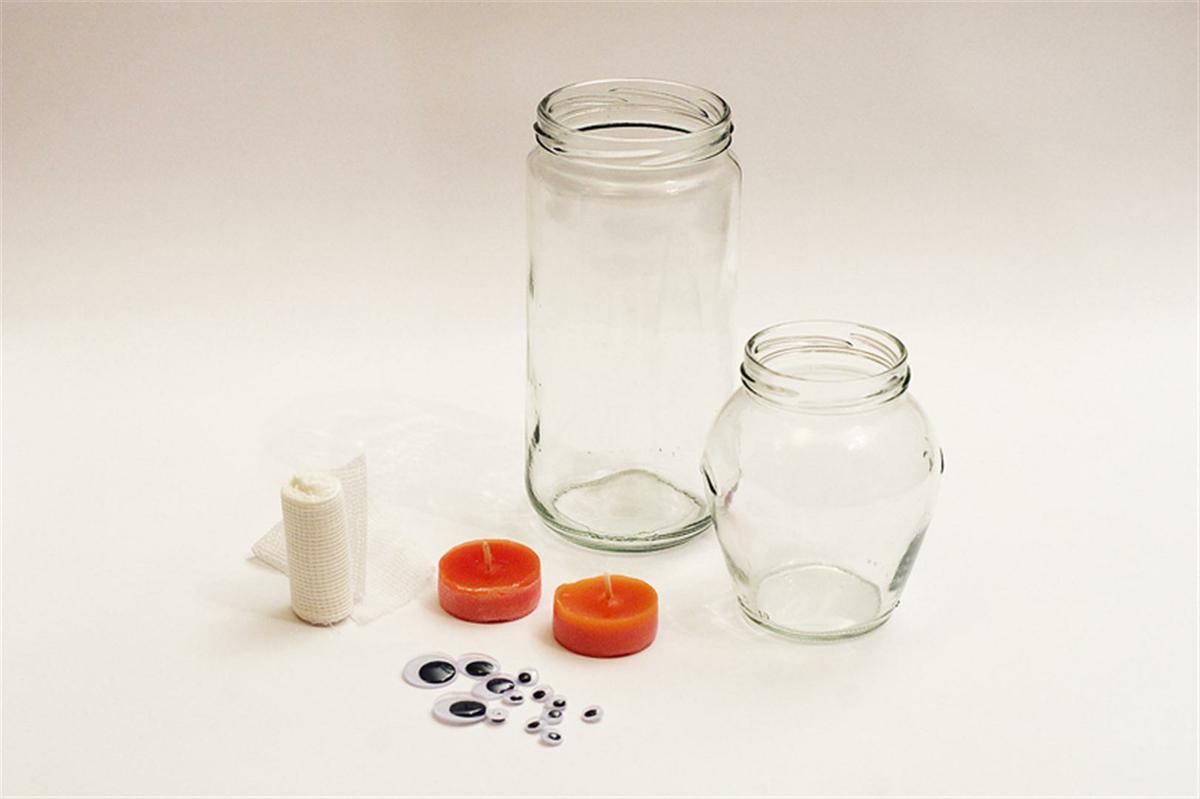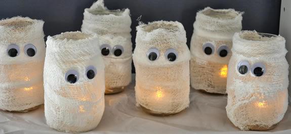 Para realizarlas necesitaremos unos botes de cristal a los que les enrollaremos una gasa o venda y luego pondremos los ojos ,que podemos encontrar en cualquier bazar o podemos hacerlos también con cartulina y por último meteremos una vela en su interior. Podemos darles otros usos como botes para chucherías .