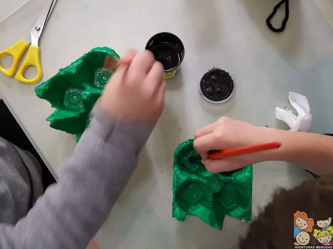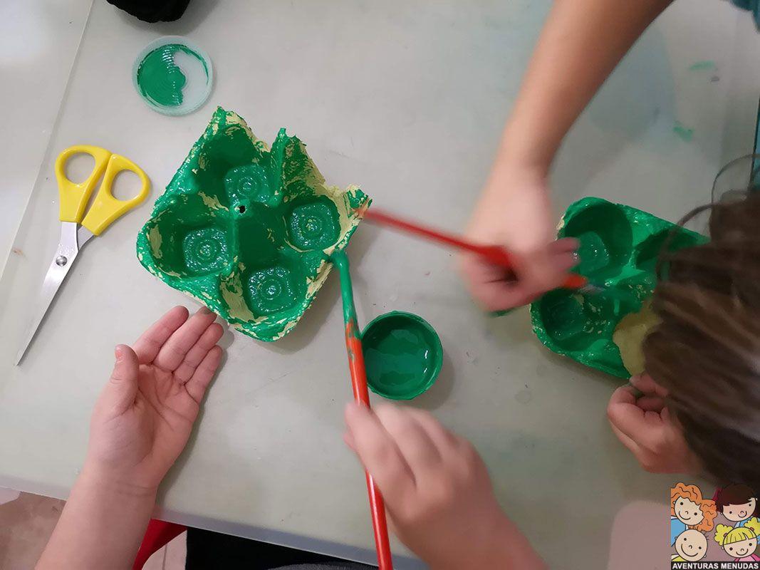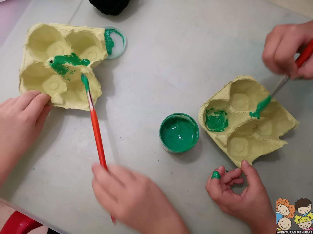 Pintamos de verde con temperas la parte frontal de las hueveras.
