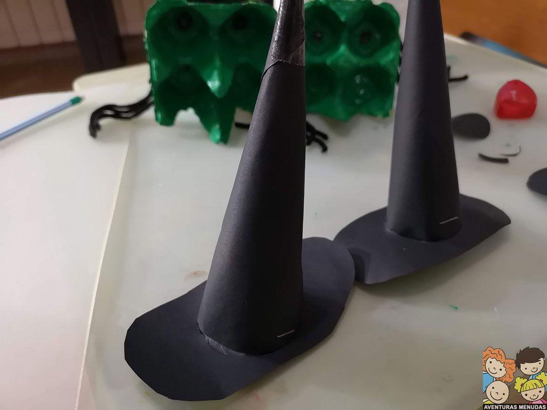 Con cartulina negra, creamos un sombrero de pico, usando pegamento para sujetarlo y fijarlo en la parte superior de la cabeza de la bruja.