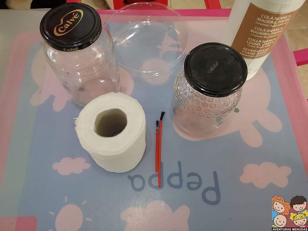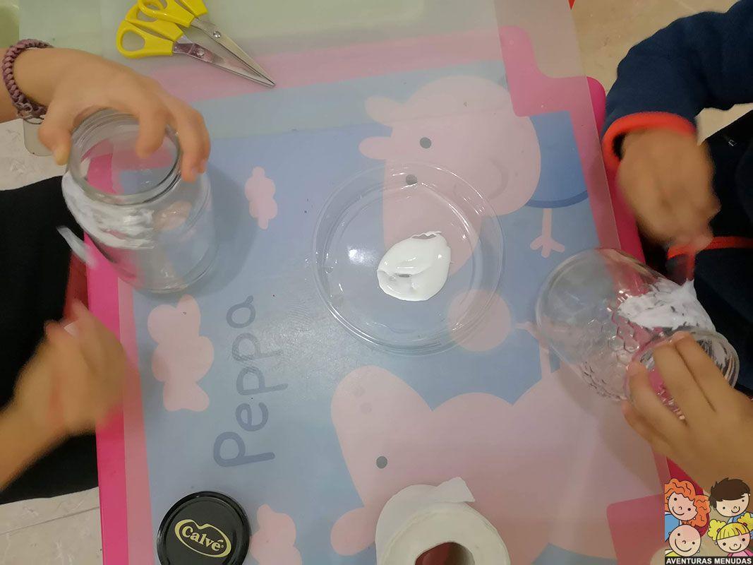 Lo primero pintamos con cola la parte exterior de los botes con un pincel.