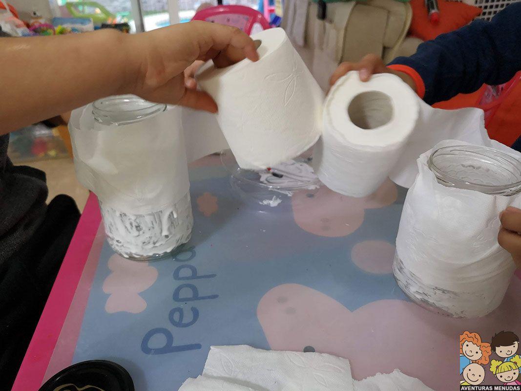 Vamos pegando el papel de WC sobre la cola, dando varias vueltas en cada capa.